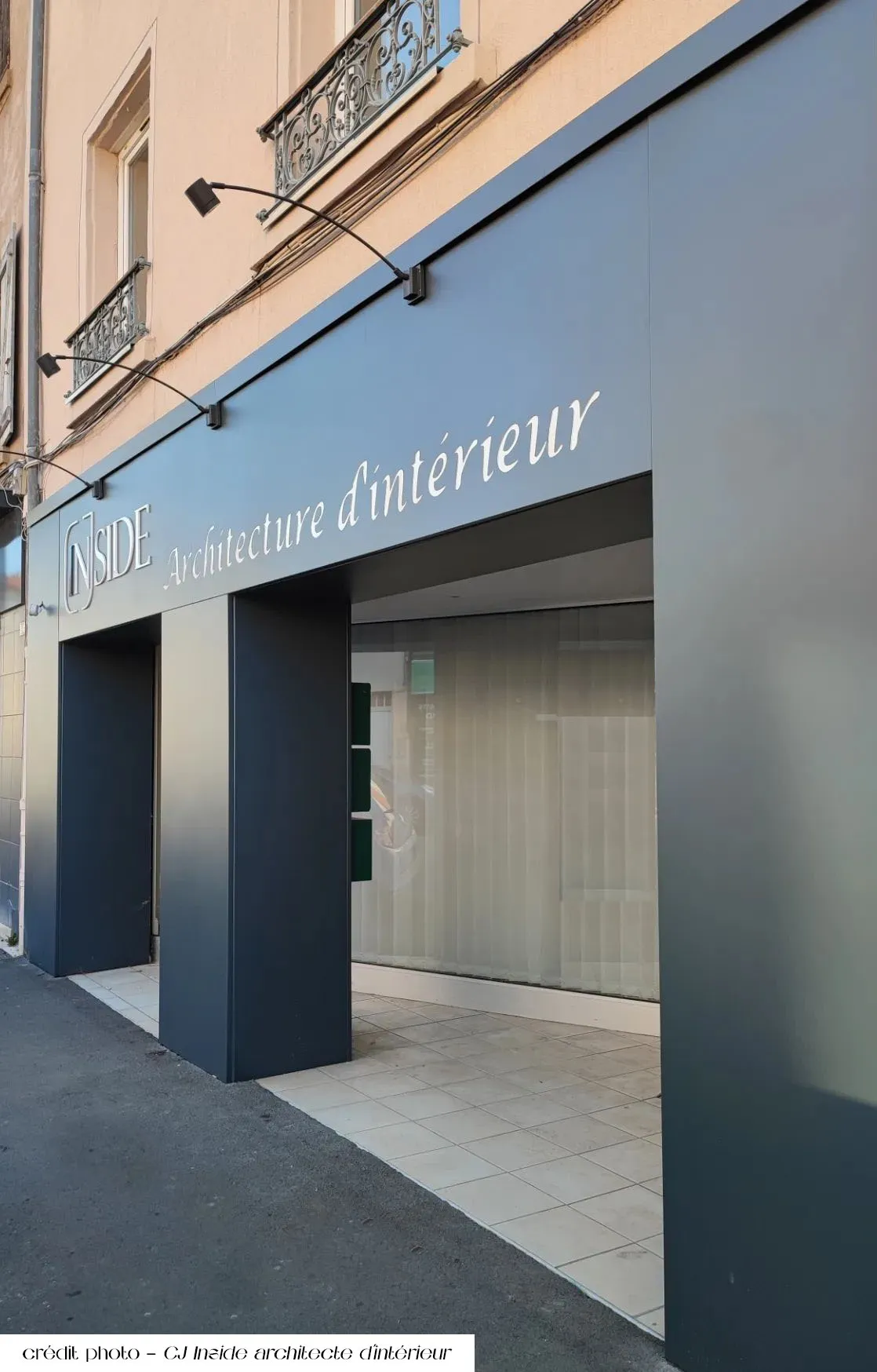 Réalisation sur mesure et installation d’une devanture métallique pour CJ Inside, cabinet d’architecture d’intérieur à Villefranche-sur-Saône.